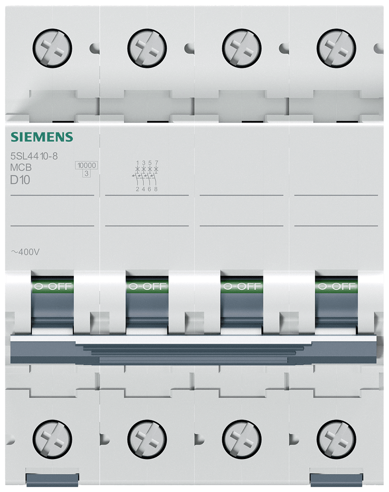 Interruttore magnetotermico 400V 10 kA, a 4 poli, D, 10A Interruttore magnetotermico SENTRON per la protezione da cortocircuito e sovraccarico sicura per applicazioni standard in edifici residenziali e funzionali. Montaggio e smontaggio dellapparecchio senza attrezzi. Semplice cablaggio dellalimentazione mediante la sbarra collettrice posteriore. Gli interruttori magnetotermici 5SL sono disponibili in esecuzione a 1, 2, 3, 4 poli nonché a 1 polo +N e a 3 poli +N nonché in ulteriori tipi speciali. I numerosi accessori, come ad es. i blocchetti di contatti ausiliari, consentono una varietà di ampliamenti funzionali. Semplicemente sicuri con gli apparecchi di protezione di SENTRON.