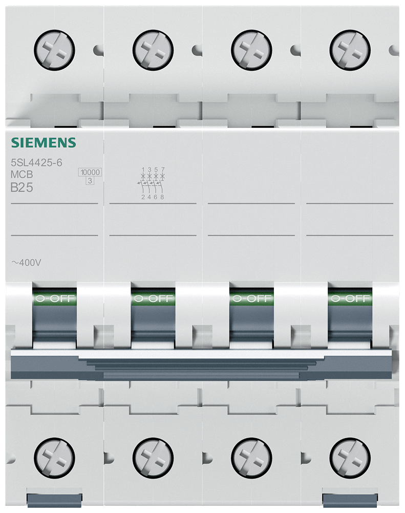 Interruttore magnetotermico 400V 10 kA, a 4 poli, B, 25A Interruttore magnetotermico SENTRON per la protezione da cortocircuito e sovraccarico sicura per applicazioni standard in edifici residenziali e funzionali. Montaggio e smontaggio dellapparecchio senza attrezzi. Semplice cablaggio dellalimentazione mediante la sbarra collettrice posteriore. Gli interruttori magnetotermici 5SL sono disponibili in esecuzione a 1, 2, 3, 4 poli nonché a 1 polo +N e a 3 poli +N nonché in ulteriori tipi speciali. I numerosi accessori, come ad es. i blocchetti di contatti ausiliari, consentono una varietà di ampliamenti funzionali. Semplicemente sicuri con gli apparecchi di protezione di SENTRON.