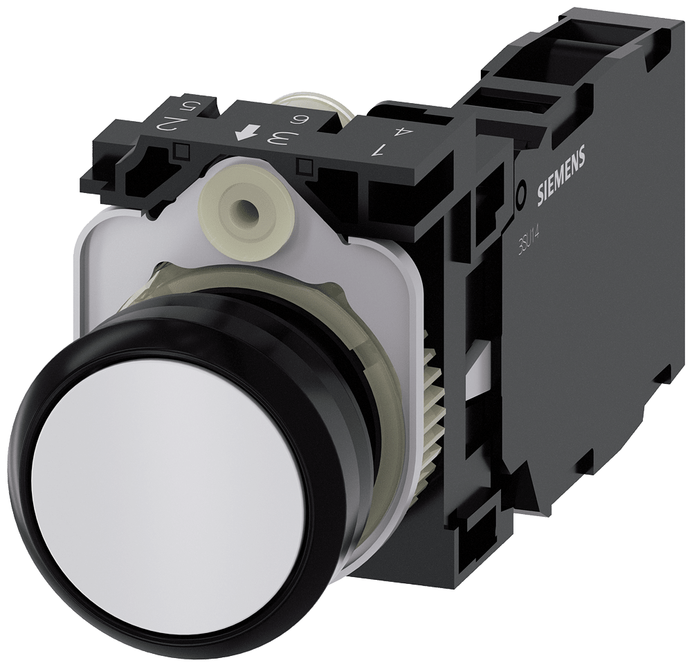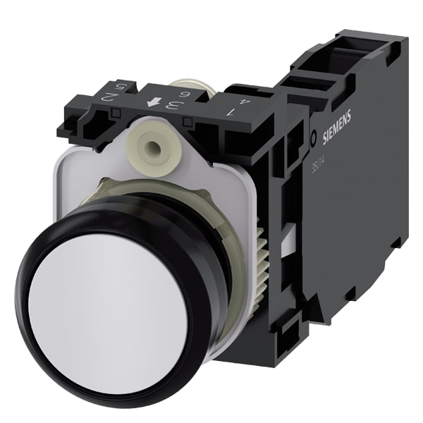 pulsante, 22 mm, rotondo, in plastica, bianco, bottone, piatto, ad impulso, con supporto 1 NO+1 NC, morsetto a vite, Pulsante SIRIUS ACT per la commutazione e il comando di utilizzatori elettrici. Siemens offre, sotto il nome commerciale SIRIUS ACT, un portfolio esclusivo di dispositivi di comando e segnalazione con omologazioni di prodotto per il mercato mondiale in tre moderne serie di design in robusto metallo puro e plastica pregiata.Linnovativo concetto di innesto a scatto semplifica talmente il montaggio che per eseguirlo basta una sola mano e non servono attrezzi speciali. Per i fori di montaggio sono sufficienti semplici fori non scanalati, essendo già integrata una protezione antirotazione al 100 %.Grazie al grado di protezione elevato i robustiapparecchi sono adatti allimpiego industriale e in ambiente esterno. È persino possibile la pulizia con getto ad alta pressione. Né polvere, né oli, né liscivia possono comprometterne il funzionamento affidabile.Oltre che con il cablaggio standard, gli apparecchi possono essere collegati al controllore anche tramite PROFINET, AS-Interface oppure IO-Link. Potete così ridurre il vostro onere di cablaggio, minimizzare le fonti di errore e ottenere maggiore flessibilità.Il configuratore online grafico supporta in modo confortevole la scelta e lordinazione di singoli apparecchi, pulsantiere e iscrizioni. È disponibile una documentazione completa (ad es. manuale, dati 3D, schema di collegamento). Esecuzioni fornibili: più colori, luminoso/non luminoso, con/senza iscrizione, comando permanente/ad impulso, diverse altezze di bottone e ghiera. Avvertenza: Apparecchio completo, fornitura incl. supporto e moduli. SIRIUS ACT - Performance in Action nel comando e nella segnalazione. Semplici da montare, altamente performanti, semplicemente perfetti.