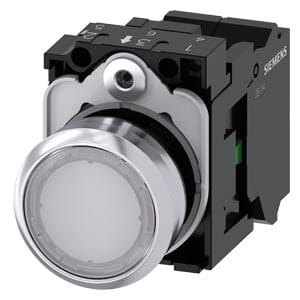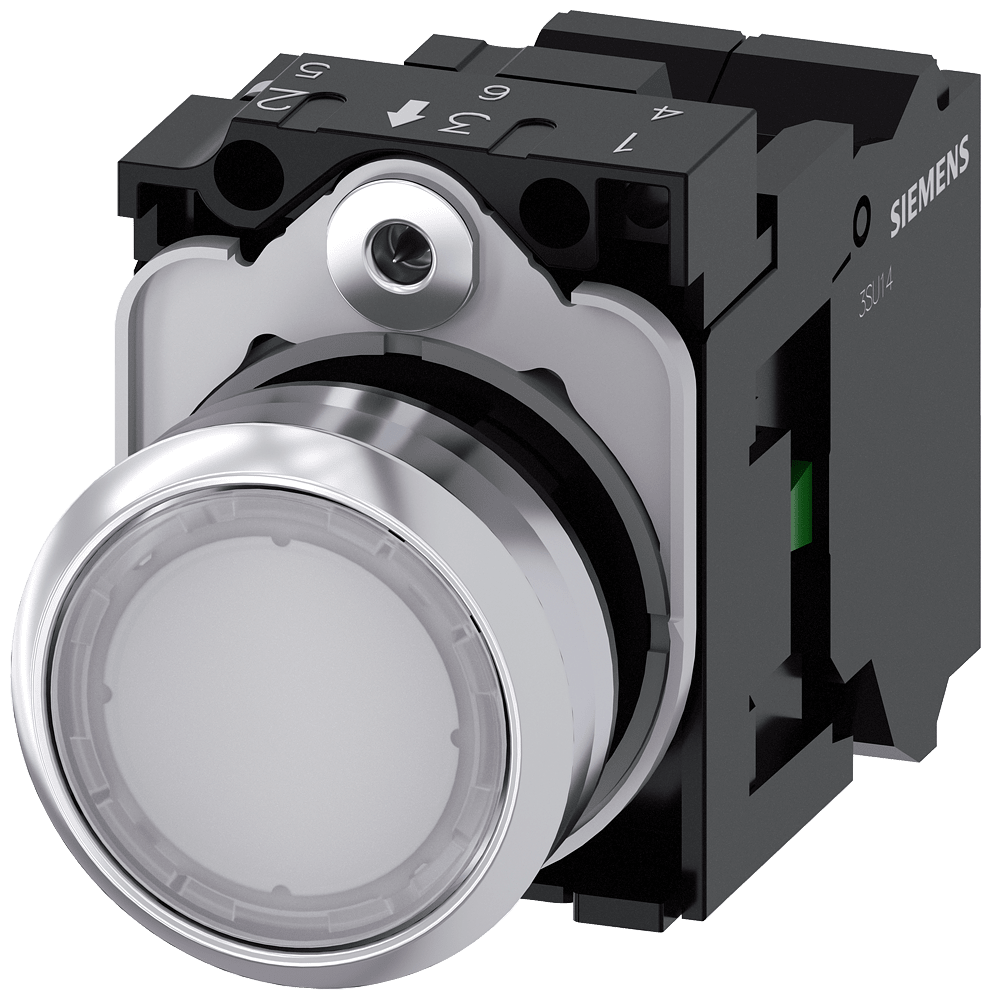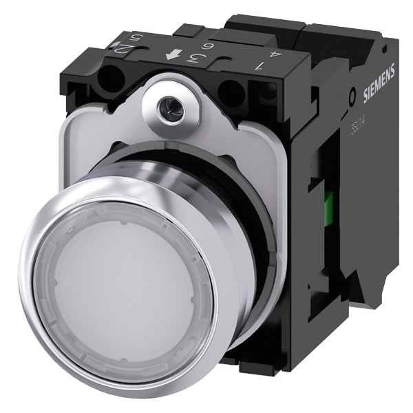 pulsante luminoso, 22 mm, rotondo, in metallo, lucido, bianco, bottone, piatto, ad impulso, con supporto, 1 NO, modulo LED con LED integrato AC 230 V, morsetto a molla Pulsanti luminosi SIRIUS ACT per la commutazione e il comando di utilizzatori elettrici. Siemens offre, sotto il nome commerciale SIRIUS ACT, un portfolio esclusivo di dispositivi di comando e segnalazione con omologazioni di prodotto per il mercato mondiale in tre moderne serie di design in robusto metallo puro e plastica pregiata.Linnovativo concetto di innesto a scatto semplifica talmente il montaggio che per eseguirlo basta una sola mano e non servono attrezzi speciali. Per i fori di montaggio sono sufficienti semplici fori non scanalati, essendo già integrata una protezione antirotazione al 100 %.Grazie al grado di protezione elevato i robusti apparecchi sono adatti allimpiego industriale e in ambiente esterno. È persino possibile la pulizia con getto ad alta pressione. Né polvere, né oli, né liscivia possono comprometterne il funzionamento affidabile.Oltre che con il cablaggio standard, gli apparecchi possono essere collegati al controllore anche tramite PROFINET, AS-Interface oppure IO-Link. Potete così ridurre il vostro onere di cablaggio, minimizzare le fonti di errore e ottenere maggiore flessibilità.Il configuratore online grafico supporta in modo confortevole la scelta e lordinazione di singoli apparecchi, pulsantiere e iscrizioni. È disponibile una documentazione completa (ad es. manuale, dati 3D, schema di collegamento). Esecuzioni fornibili: più colori, luminoso/non luminoso, con/senza iscrizione, comando permanente/ad impulso, diverse altezze di bottone e ghiera. Avvertenza: Apparecchio completo, fornitura incl. supporto e moduli. SIRIUS ACT - Performance in Action nel comando e nella segnalazione. Semplici da montare, altamente performanti, semplicemente perfetti.