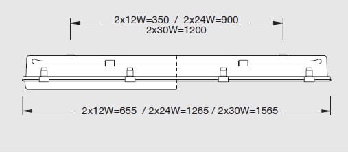 Rendimento luminoso 100%. Flusso luminoso dell'apparecchio 7286 lm. istribuzione ampia simmetrica. UGR <22 (EN 12464-1). fficienza apparecchio 107 lm/W. Corpo in acciaio stampato in un unico pezzo, trattamento di fosfosgrassaggio ai sali di ferro, verniciato a polvere epossipoliestere di colore bianco, stabilizzato agli UV. Vetro stampato anabbagliante, non combustibile, temprato, alloggiato e bloccato alla cornice perimetrale monoblocco in acciaio zincato, guarnizione di tenuta, apertura a cerniera tramite scrocchi in acciaio zincato. Recuperatore di flusso ampio, sovradimensionato, in alluminio a specchio con trattamento superficiale al titanio e magnesio, assenza di iridescenza. Elemento portacablaggio in acciaio zincato a caldo, verniciato a base poliestere di colore bianco, fissato al corpo mediante dispositivi rapidi "Ribloc" in acciaio zincato, apertura a cerniera. Cablaggio elettronico EEI A2, 230V-50/60Hz, fattore di potenza >0,95, corrente costante in uscita, classe I. Potenza dell'apparecchio 68 W. CE - IEC 60598-1 - EN 60598-1. Temperatura ambiente da -20°C fino a +35°C. Ingresso linea in testata o superiormente, tramite pressacavo PG 13,5 in nylon autoestinguente. Cablaggio emergenza permanente EP, su un solo modulo LED, autonomia 1h, ricarica 24h, fusibile. EN 60598-2-22. 2 moduli LED lineari da 30W/840, temperatura di colore 4000 K. Resa cromatica Ra >80. Tolleranza del colore (MacAdam): 3. Durata utile (L90/F10): 30.000 h. Durata utile (L85/F10): 50.000 h. Sicurezza fotobiologica conformeal gruppo di rischio esente RG0, norma IEC 62471. Ambienti industriali, magazzini e interni asciutti, polverosi, con occasionali getti d'acqua.