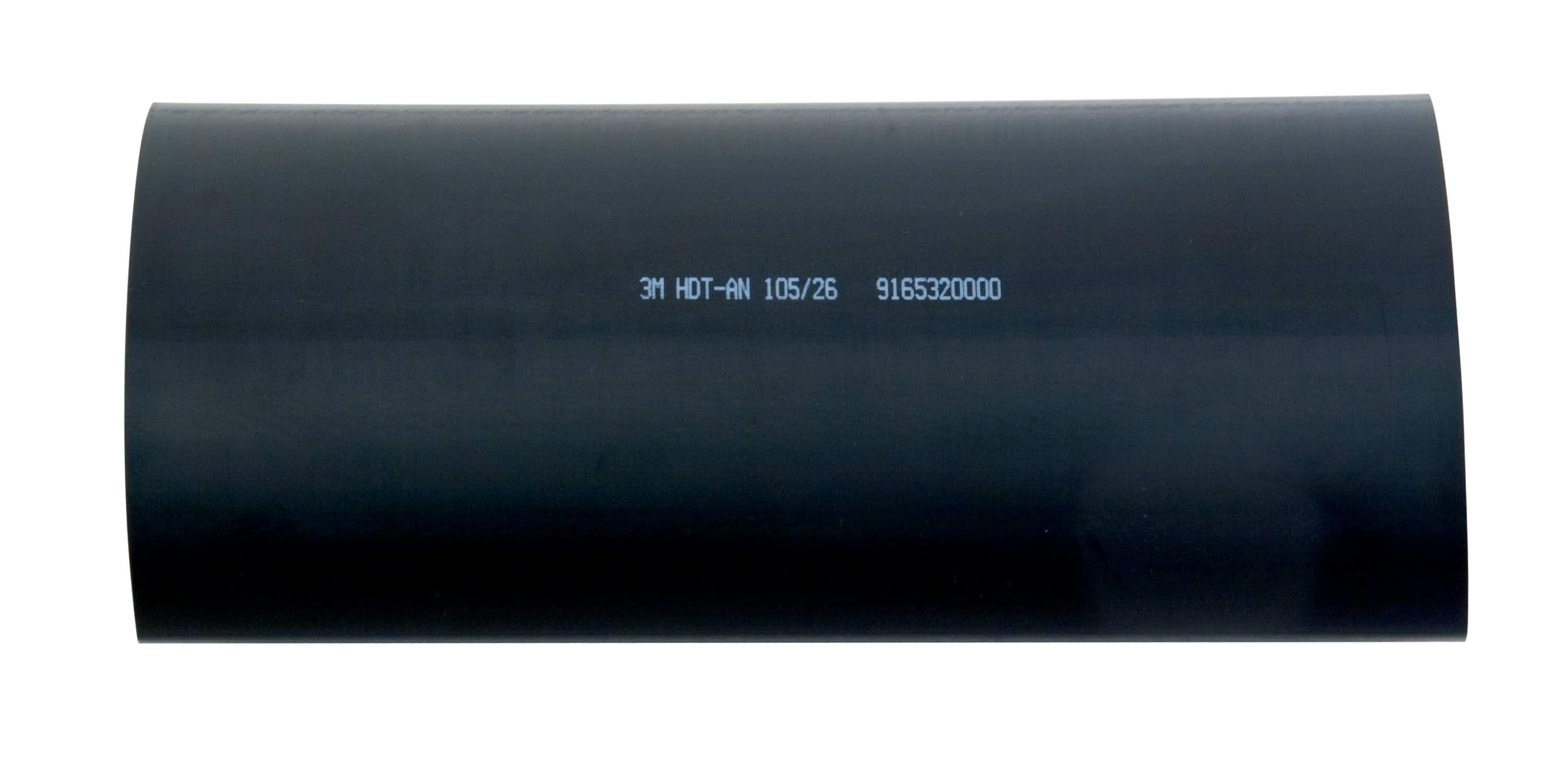 3M™ HDT-AN 105/26 mm - Guaina termorestringente a parete spessa, con adesivo termofusibile interno - Fattore di restringimento 4:1. Confezione da es La serie 3M ™ HDT-AN è una guaina termorestringente in poliolefina a parete spessa con adesivo hot meltcoestruso. Il rapporto di restringimento è fino a 4: 1. La temperatura minima di restringimento è di 135 ° C, mentre la temperatura operativa è compresa tra -55 ° C e + 130 ° C. La guaina HDT-AN offre una buona resistenza chimica. E' una guaina priva di alogeni. La sua buona robustezza meccanica rendono questo termorestringente adatto per applicazioni in esterno. La serie HDT-AN viene fornita con uno strato adesivo hot melt, molto liscio e costante, applicato durante l'estrusione della guaina, che assicura eccellenti proprietà di tenuta ed un grado di protezione IP 68. La HDT-AN è ideale per sigillare giunti e terminazioni di cavi in ¿¿linea interrati o esposti. La serie HDT-AN è disponibile in taglie da 12,0 / 3,0 mm a 130,0 / 36,0 mm con uno spessore di parete (recuperato) di 2,5-5,5 mm . Colore nero. Confezione standard: pezzi da 1 m in confezione da esposizione. Certificato: conforme alla normativa RoHS.