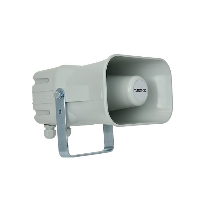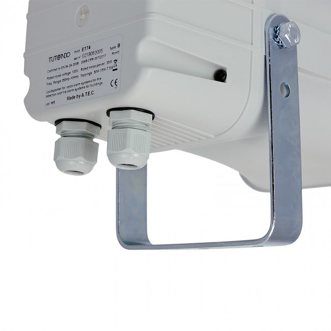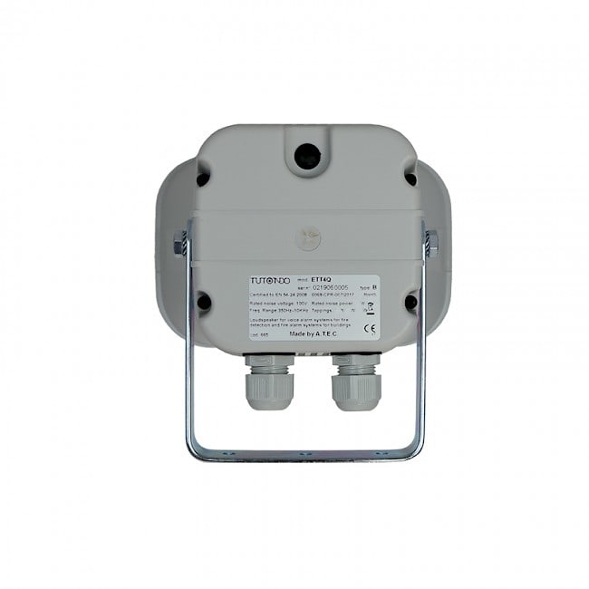 ETT4Q30: diffusore a tromba. Diffusore acustico a tromba ripiegata di sezione rettangolare, certificato EN54-24, contenitore in ABS autoestinguente conforme UL94V0, con staffa di fissaggio. • Grado di protezione IP66. Trasformatore audio a 100V, selezione di potenza, con filtro passa alto. • Potenza 30-15-7,7 W. • Impedenza nom.:333 - 666 - 1333 ohm • Risposta in frequenza: 350 - 10000 Hz • Sensibilità 1W/1m: 105,5dB • SPL max: 120,2dB • Peso: 1,9 kg. • Dimensioni A 117 (170) x L 180,5 x P 231 mm. • Colore: grigio chiaro