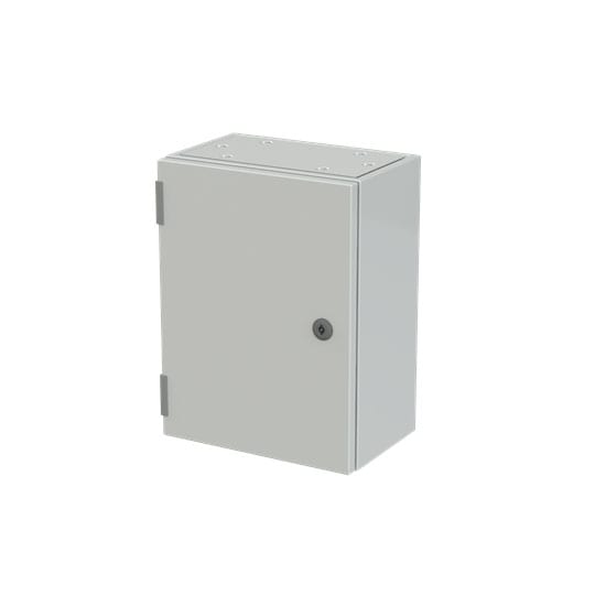 Cassa con porta cieca e piastra di fondo serie SR2, struttura in lamiera d'acciaio spessore 12/10, piastra di fondo in lamiera zincata spessore 20/10. Utilizzata per la realizzazione di quadri di comando e controllo delle più varie macchine industriali: da grossi macchinari a linee automatizzate di produzione o parti di esse, alle tipiche installazioni di quadri bordo macchina, a caldaie, impianti di riscaldamento ed altro ancora.