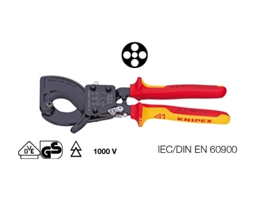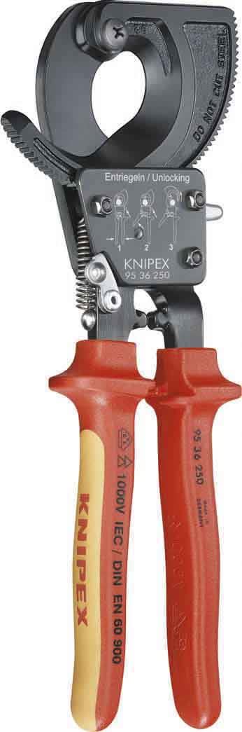 Cesoie a cremagliera per cavi elettrici in acciaio speciale a forte spessore, bonificato, forgiato e temperato ad olio - Testa brunita. Manici bicomponenti a forte spessore con paramani. Per il taglio netto, preciso e senza deformazione di cavi elettriciin rame ed alluminio ad uno o più conduttori a fili sottili. Il rapporto ottimale fra la ganascia dentata e la leva, consente elevate prestazioni con taglio progressivo ad una sola mano con minimo sforzo. L’avanzamento a cremagliera è sbloccabile in qualsiasi posizione di taglio. Avanzamento della lama regolabile in due posizioni per adattarlo alle diverse forze di taglio. Impiego anche in condizioni di spazi ristretti. Adatte anche per spelare cavi - NON adatte per funi di acciaio. Manici rivestiti in resina termoplastica. Manici in materiale bicomponente a forte spessore. •Lunghezza totale 280 mm •Cavi elettrici (alluminio o rame) sezione 380 mm² •Apertura massima per cavi Ø 52 mm
