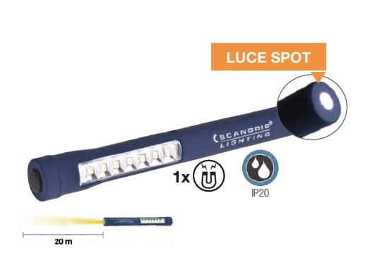 Torce professionali per ispezioni:Torcia a penna con luce SPOT. Ad altissima luminosità - Costruzione robusta, resistente e di alta qualità, Particolarmente adatte per ispezione e manutenzione, Mod. "MAG PEN", Torcia a penna ricaricabile, con lucespot sulla testa, Corpo robusto con rivestimento in gomma, con clip da taschino, Con magnete per essere posizionata ovunque occorra e clip di fissaggio, Luce principale: 7 PLCC2 SMD LED da 0,06 W, 60 lumen - 100 lux, autonomia batteria 4h, Lucesuperiore: 1 LED da 0,5 W, 15 lumen - 500 lux, autonomia batteria 4h, Lunghezza max. fascio luminoso 20 m, Batteria ricaricabile agli ioni di Litio (Li-on) da 3,7V (750 mAh), Tempo di ricarica ca. 3h, Dimensioni Ø 23 x 168 mm.