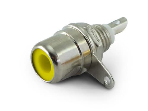 ** Caratteristiche Generali ** Genere: Presa Tipo Connettore: RCA Colore: Giallo Adatto per: Fam.17 ** Caratteristiche Meccaniche ** Materiale Corpo: Ottone nichelato Materiale Contatto: Ottone nichelato Tipo contatto: a saldare Montaggio connettore: pannello