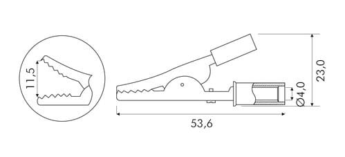 ** Caratteristiche Generali ** Tipo Connettore: Pinza Colore: Nero ** Caratteristiche Elettriche ** Corrente max: 10A Tensione max: 50V ** Caratteristiche Meccaniche ** Materiale Corpo: ABS Materiale Contatto: Acciaio nichelato Diametro cavo max: 4mm