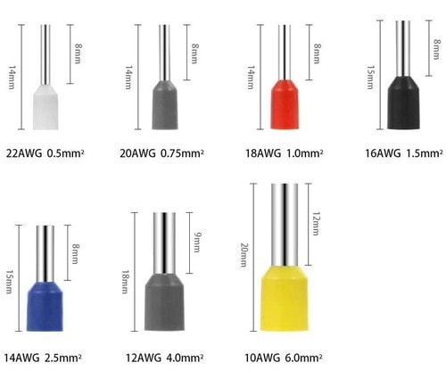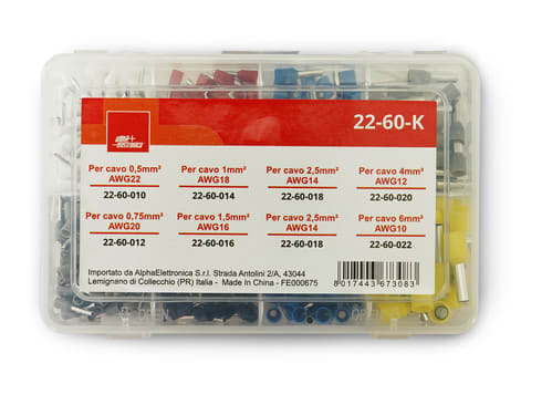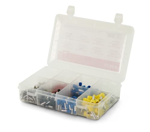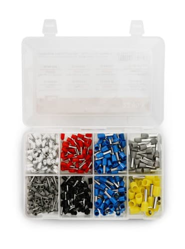 Pratica scatoletta con otto scomparti di puntalini capicorda a bussola per cavi da 0,5 a 6,0mm². La confezione contiene: 22-60-010 bianco - 0,5mm² - 22AWG - 100pz 22-60-012 grigio - 0,75mm² - 20AWG - 100pz 22-60-014 rosso - 1,0mm² - 18AWG - 50pz 22-60-016 nero - 1,5mm² - 16AWG - 50pz 22-60-018 blu - 2,5mm² - 14AWG - 50+50pz 22-60-020 grigio - 4,0mm² - 12AWG - 25pz 22-60-022 giallo - 6,0mm² - 10AWG - 25pz Totale: 450 pezzi