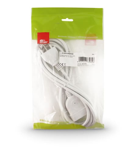 ** Caratteristiche ** Colore cavo: Bianco Lunghezza Cavo: 3m Formazione cavo: 3 x 1mm² Tipo Cavo: Tondo Portata: 16A Tensione massima: 250V Nome tecnico: H05VV-F ** Connettore A ** Tipo Connettore A: Spina Italia 16A ** Connettore B ** Tipo Connettore B: Presa Bipasso Dritto