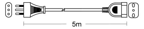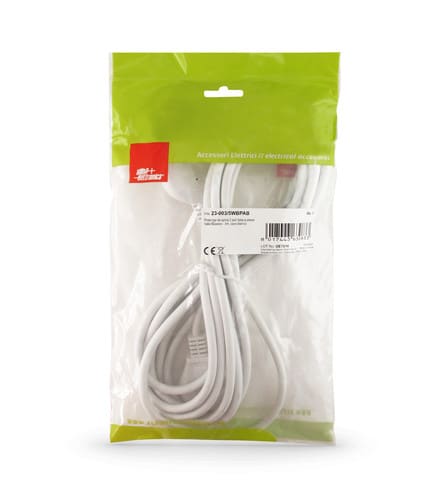 ** Caratteristiche ** Colore cavo: Bianco Lunghezza Cavo: 5m Formazione cavo: 3 x 1mm² Tipo Cavo: Tondo Portata: 16A Tensione massima: 250V Nome tecnico: H05VV-F ** Connettore A ** Tipo Connettore A: Spina Italia 16A ** Connettore B ** Tipo Connettore B: Presa Bipasso Dritto