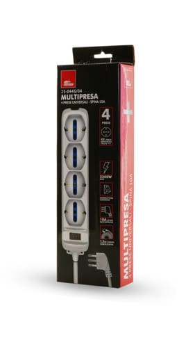 ** Caratteristiche Generali ** Colore: Bianco Tipo di prese: Universale Italia P40 Numero di prese Universali: 4 Numero di Prese Totali: 4 Tipo di spina: Italia - 10A 2P+T S11 - Salvaspazio ad angolo ** Caratteristiche Elettriche ** Tensione max: 250V Potenza max collegabile: 2500W ** Caratteristiche Meccaniche ** Materiale corpo: Termoplastico Materiale contatti: Lega di rame Cavo Alimentazione: H05VV-F 3G1 3x1,0mm² Lunghezza cavo complessiva: 1.5m Colore cavo: Bianco Accensione: Con interruttore luminoso Sistemi sicurezza: Alveoli protetti da contatti accidentali, Prese con protezione bimbi Protezioni: Messa a terra per ogni presa, Sovraccarico
