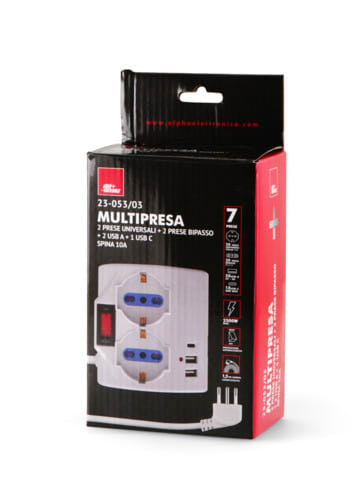 ** Caratteristiche Generali ** Colore: Bianco Tipo di prese: Bipasso P17/11, Universale Italia P40 Numero di prese Bipasso: 2 Numero di prese Universali: 2 Numero di Prese Totali: 7 Tipo di spina: Italia 10A - 10A 2P+T S11 - Salvaspazio ad angolo ** Caratteristiche Elettriche ** Tensione max: 250V Corrente max: 10A Potenza max collegabile: 2500W ** Caratteristiche Meccaniche ** Materiale corpo: Termoplastico rinforzato Materiale contatti: Lega di rame Cavo Alimentazione: H05VV-F 3G1 3x1,0mm² Lunghezza cavo complessiva: 1.5m Colore cavo: Bianco Accensione: Con interruttore luminoso Sistemi sicurezza: Alveoli protetti da contatti accidentali, Prese con protezione bimbi Protezioni: Messa a terra per ogni presa, Sovraccarico