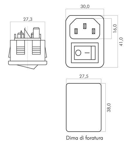 ** Caratteristiche Generali ** Genere: Spina Norma di riferimento: EN 60320 Foglio tecnico: C14 ** Caratteristiche Elettriche ** Corrente max: 10A Tensione max: 250V ** Caratteristiche Meccaniche ** Materiale Corpo: Termoplastico rinforzato con fibra di vetro Materiale Contatto: Lega di rame Tipo contatto: faston 4.8mm Montaggio connettore: pannello Foro fissaggio: 27.5mm x 38mm ** Caratteristiche Termiche ** Temperatura di lavoro: 0/70°C