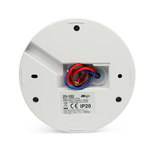 Sensore circolare di movimento ad infrarossi per interno. ** Caratteristiche Generali ** Principio di funzionamento: Infrarossi Colore: Bianco ** Caratteristiche Elettriche ** TipoTensione: ac Tens. funzionamento AC: 230Vac Tolleranza d'ingresso: ±10% Frequenza: 50Hz Consumo energetico stand-by: 0.1W Consumo energetico operativo: 0.45W Classe Isolamento: II ** Caratteristiche dei contatti ** Potenza massima carico capacitivo: 300W Potenza massima carico resistivo: 1200W ** Installazione ** Luogo d'impiego: Interno Montaggio: Soffitto Altezza d'installazione: 3m Campo di rilevamento: 360° Range max di movimento: 6m ** Caratteristiche Meccaniche ** Dimensioni (LxWxH): 118.5 x 118.5 x 58.5mm Grado di protezione: IP20 ** Regolazioni ** Periodo di accensione: 5s - 9min Livello di luminosità: 3 - 2000lux Livello di sensibilità: 3 - 6m ** Caratteristiche Termiche ** Temp. di funzionamento: -10 / 40°C