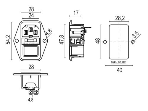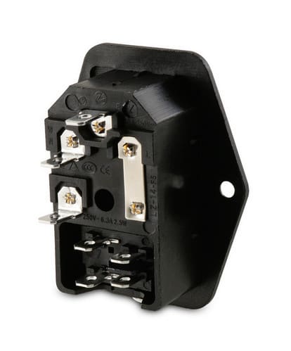 Portafusibile 5x20 max 10A 250V ** Caratteristiche Generali ** Genere: Spina Foglio tecnico: C14 Colore: Nero Orientamento: Dritto ** Caratteristiche Elettriche ** Corrente max: 10A Tensione max: 250V ** Caratteristiche Meccaniche ** Materiale Corpo: Termoplastico rinforzato con fibra di vetro Materiale Contatto: Lega di rame Tipo contatto: faston 4.8mm Montaggio connettore: pannello Foro fissaggio: 28.2mm x 48mm ** Caratteristiche Termiche ** Temperatura di lavoro: 0/70°C