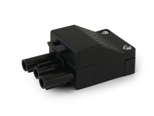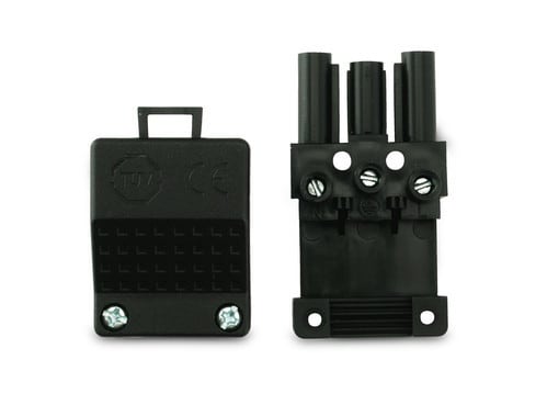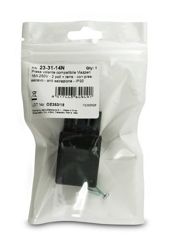 Connettore 3 poli anti estrazione 16A 500V tipo Mazzeri. Giunzione professionale con classe di infiammabilità UL 94 V-2. Verificare attentamente la compatibilità dell'involucro e dei contatti interni maschio e femmina. ** Caratteristiche Generali ** Genere: Presa Tipo Connettore: Mazzeri Colore: Nero Orientamento: Dritto ** Caratteristiche Elettriche ** Corrente max: 16A Tensione max: 500V ** Caratteristiche Meccaniche ** Terminazione: serraggio a vite Montaggio connettore: volante Sezione conduttori: 0.75-1.5mm²