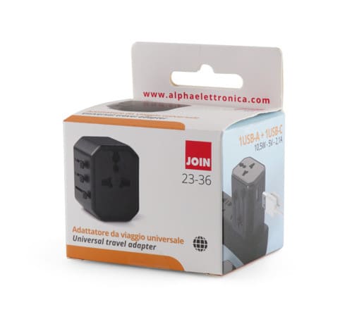 Adattatore universale da viaggio, utilizzabile in più di 150 paesi nel mondo per alimentare tutti i dispositivi elettronici. In particolare utilizzabile in Europa, Regno Unito, Stati Uniti e Australia. Destinato ad alimentare dispositivi elettronici compatibili fino a 2500W a 250V e 1000W a 100V. Può essere utilizzato con una moltitudine di apparecchi quali: - dispositivi a 2 poli senza terra: notebook, piccoli asciugacapelli da viaggio, ferri da stiro da viaggio, ventilatore elettrico, lampada da tavolo, rasoi elettrici, eccetera. - dispositivi USB: fotocamera, smartphone, tablet, console di gioco portatile, altoparlante Bluetooth, powerbank. ** Caratteristiche Generali ** Colore: Nero ** Caratteristiche Elettriche ** Tensione max: 250V Corrente max: 10A Potenza max collegabile: 2500W ** Caratteristiche Meccaniche ** Materiale corpo: Termoplastico rinforzato Materiale contatti: Lega di rame Sistemi sicurezza: Alveoli protetti da contatti accidentali 1 x Porta USB Tipo A 1 x Porta USB Tipo C USB output: 5.0V 2.1A (Totale), 2.1A Max per porta
