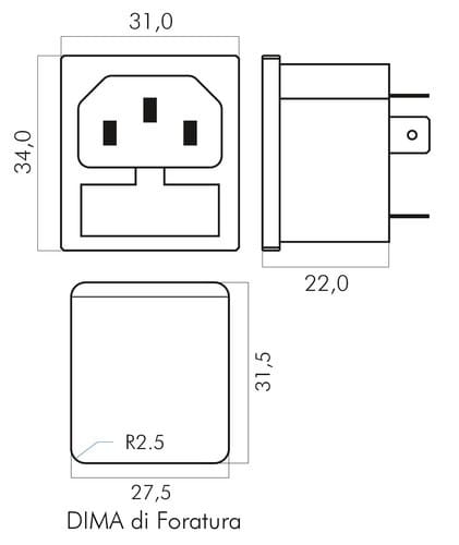 ** Caratteristiche Generali ** Genere: Spina Norma di riferimento: EN 60320 Foglio tecnico: C14 Qualità: HQ ** Caratteristiche Elettriche ** Corrente max: 10A Tensione max: 250V ** Caratteristiche Meccaniche ** Formato Fusibile: 5x20mm Materiale Corpo:Termoplastico rinforzato con fibra di vetro Materiale Contatto: Lega di rame Tipo contatto: faston 6.3mm Montaggio connettore: pannello ** Caratteristiche Termiche ** Temperatura di lavoro: 0/70°C