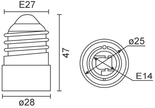 ** Caratteristiche Generali ** Attacco A: Maschio E27 Attacco B: Femmina E14 ** Caratteristiche Elettriche ** Tensione max: 240V Corrente max: 2A ** Caratteristiche Meccaniche ** Materiale corpo: Plastico ** Caratteristiche Termiche ** Temp. di funzionamento: 0 / 35°C