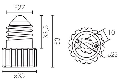 ** Caratteristiche Generali ** Attacco A: Maschio E27 Attacco B: Femmina GU10 ** Caratteristiche Elettriche ** Tensione max: 240V Corrente max: 2A ** Caratteristiche Meccaniche ** Materiale corpo: Plastico ** Caratteristiche Termiche ** Temp. di funzionamento: 0 / 35°C