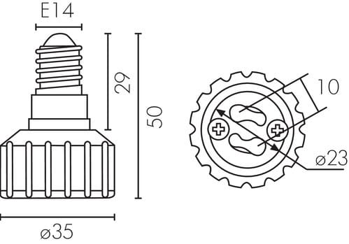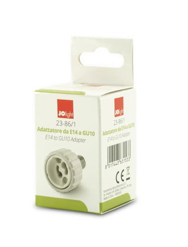 ** Caratteristiche Generali ** Attacco A: Maschio E14 Attacco B: Femmina GU10 ** Caratteristiche Elettriche ** Tensione max: 240V Corrente max: 2A ** Caratteristiche Meccaniche ** Materiale corpo: Plastico ** Caratteristiche Termiche ** Temp. di funzionamento: 0 / 35°C