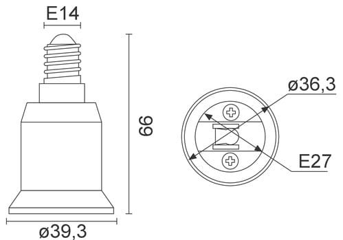 ** Caratteristiche Generali ** Attacco A: Maschio E14 Attacco B: Femmina E27 ** Caratteristiche Elettriche ** Tensione max: 240V Corrente max: 2A ** Caratteristiche Meccaniche ** Materiale corpo: Plastico ** Caratteristiche Termiche ** Temp. di funzionamento: 0 / 35°C