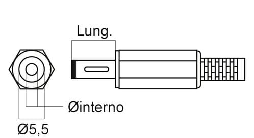 ** Caratteristiche Generali ** Genere: Spina Colore: Nero Orientamento: Dritto ** Caratteristiche Meccaniche ** Materiale Corpo: PVC Materiale Contatto: Ottone nichelato Tipo contatto: a saldare Montaggio connettore: volante Diametro Esterno: 5.5mm Diametro Interno: 2.5mm Lunghezza Contatto: 9.5mm