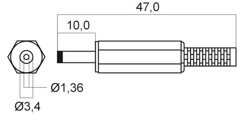 ** Caratteristiche Generali ** Genere: Spina Colore: Nero Orientamento: Dritto ** Caratteristiche Meccaniche ** Materiale Corpo: PVC Materiale Contatto: Ottone nichelato Tipo contatto: a saldare Montaggio connettore: volante Diametro Esterno: 3.4mm Diametro Interno: 1.36mm Lunghezza Contatto: 10mm