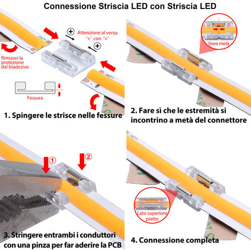 ** Caratteristiche Generali ** Adatto per tipo di Led: COB, SMD Adatto per striscia: Monocolore Larghezza nastro: 10mm Tipo connettore: Giunto N. Poli: 2 ** Caratteristiche Elettriche ** Tens. funzionamento DC: 3‑24Vdc Corrente max: 5.5A ** Caratteristiche Meccaniche ** Lunghezza: 15.6mm Larghezza: 11.6mm Altezza: 3.3mm Grado di protezione: IP20 Tipo contatto: a crimpare