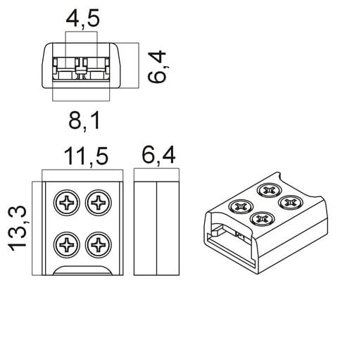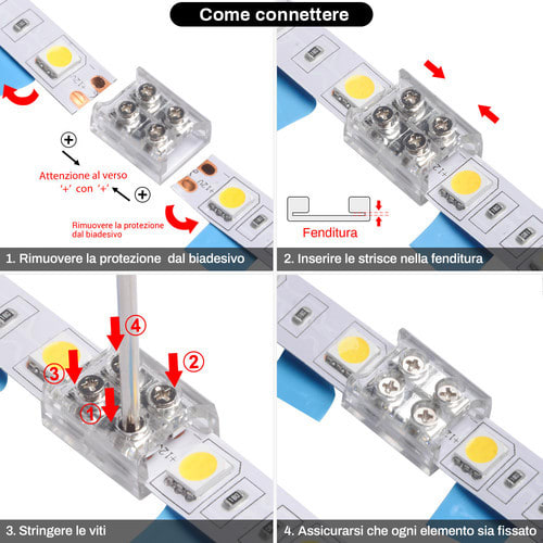 ** Caratteristiche Generali ** Adatto per tipo di Led: COB, SMD Adatto per striscia: Monocolore Larghezza nastro: 8mm Tipo connettore: Giunto N. Poli: 2 ** Caratteristiche Elettriche ** Tens. funzionamento DC: 3‑24Vdc Corrente max: 6A ** Caratteristiche Meccaniche ** Lunghezza: 14.6mm Larghezza: 11.5mm Altezza: 6.4mm Grado di protezione: IP20 Tipo contatto: a vite Compatibile con strisce Led COB e SMD fino ad un massimo di 140 led/m. Verificare che la distanza massima tra il taglio e il Led sia superiore ai 3.5mm.