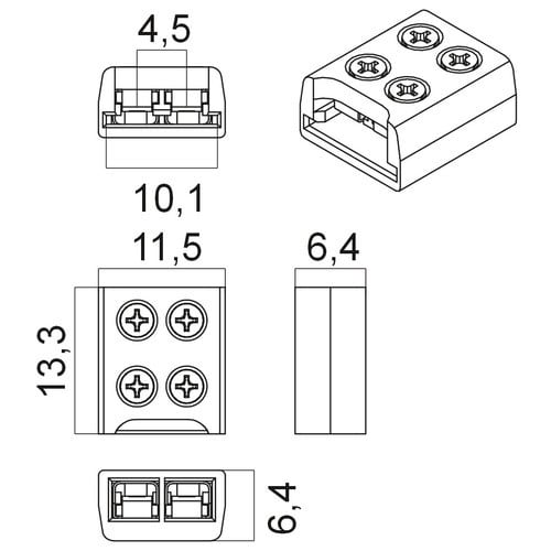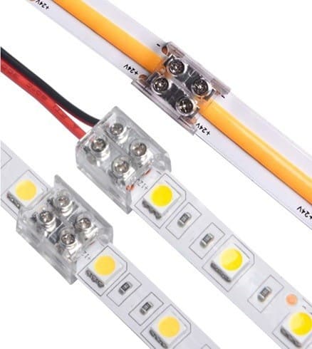 ** Caratteristiche Generali ** Adatto per tipo di Led: COB, SMD Adatto per striscia: Monocolore Larghezza nastro: 10mm Tipo connettore: Connettore striscia/fili Sezione AWG: 20AWG N. Poli: 2 ** Caratteristiche Elettriche ** Tens. funzionamento DC: 3‑24Vdc Corrente max: 6A ** Caratteristiche Meccaniche ** Lunghezza: 13.3mm Larghezza: 11.5mm Altezza: 6.4mm Grado di protezione: IP20 Tipo contatto: a vite Compatibile con strisce Led COB e SMD fino ad un massimo di 140 led/m. Verificare che la distanza massima tra il taglio e il Led sia superiore ai 3.5mm.