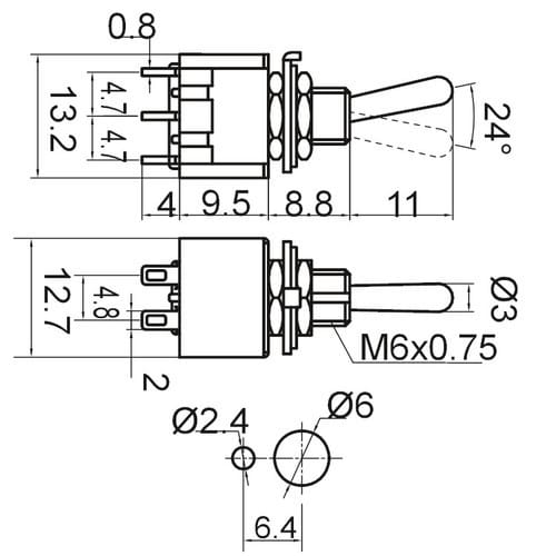 ** Caratteristiche Generali ** Attuatore: Levetta Serie: Miniatura Serigrafia: Nessuna Luminoso: no Materiale attuatore: Ottone nichelato Tipi contatti: DPDT Portata: 3A@250Vac, 6A@125Vac N. poli: 2 Stato dei contatti: ON/ON Tipo terminale: a saldare N. terminali: 6 Montaggio: Pannello con dado Foro fissaggio: ø6mm