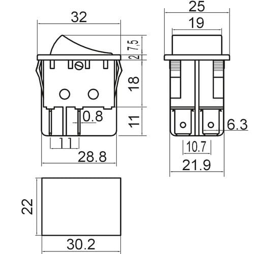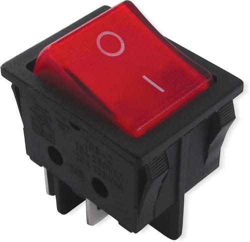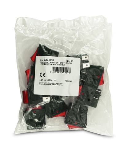 ** Caratteristiche Generali ** Attuatore: Bilanciere Serigrafia: I/O Luminoso: no Colore: Rosso Materiale attuatore: Plastica Tipi contatti: DPST Portata: 15A@250Vac, 20A@125Vac N. poli: 2 Stato dei contatti: ON/OFF Tipo terminale: faston 6,3 N. terminali: 4 Montaggio: Pannello a incastro Foro fissaggio: 22mm x 30.2mm