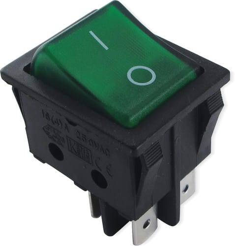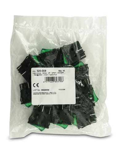 ** Caratteristiche Generali ** Attuatore: Bilanciere Serigrafia: I/O Luminoso: no Colore: Verde Materiale attuatore: Plastica Tipi contatti: DPST Portata: 15A@250Vac, 20A@125Vac N. poli: 2 Stato dei contatti: ON/OFF Tipo terminale: faston 6,3 N. terminali: 4 Montaggio: Pannello a incastro Foro fissaggio: 22mm x 30.2mm