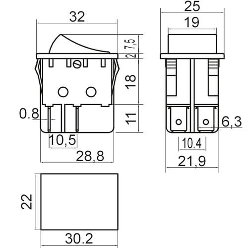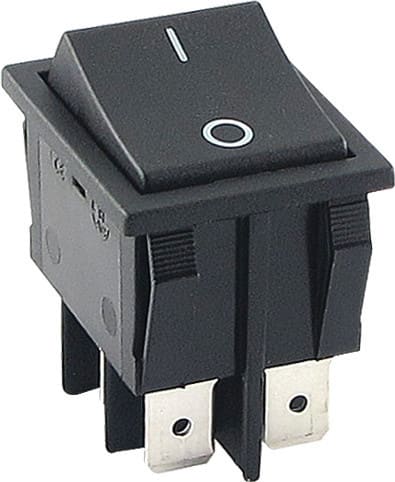 ** Caratteristiche Generali ** Attuatore: Bilanciere Serigrafia: I/O Luminoso: no Colore: Nero Materiale attuatore: Plastica Tipi contatti: DPST Portata: 15A@250Vac, 20A@125Vac N. poli: 2 Stato dei contatti: ON/OFF Tipo terminale: faston 6,3 N. terminali: 4 Montaggio: Pannello a incastro Foro fissaggio: 22mm x 30.2mm