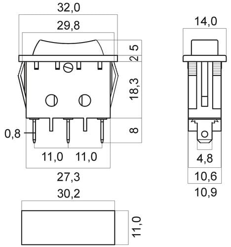 ** Caratteristiche Generali ** Attuatore: Bilanciere Forma dell'attuatore: Rettangolare Luminoso: no Colore: Nero Materiale attuatore: Plastica Tipi contatti: SPCO Portata: 15A@250Vac, 20A@125Vac N. poli: 1 Stato dei contatti: (ON)/OFF/(ON) Tipo terminale: faston 4,8 N. terminali: 3 Montaggio: Pannello a incastro Foro fissaggio: 10.6mm x 30.3mm