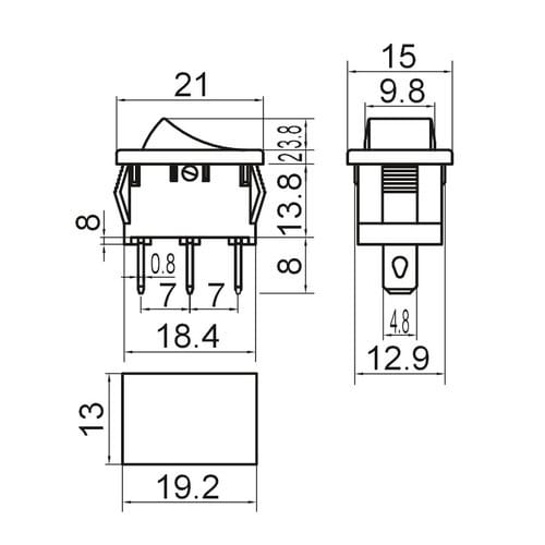 ** Caratteristiche Generali ** Attuatore: Bilanciere Serie: Miniatura Serigrafia: Nessuna Luminoso: no Colore: Nero Materiale attuatore: Plastica Tipi contatti: SPDT Portata: 6A@250Vac, 10A@125Vac N. poli: 1 Stato dei contatti: ON/ON Tipo terminale: faston 4,8 N. terminali: 3 Montaggio: Pannello a incastro Foro fissaggio: 13mm x 19.2mm