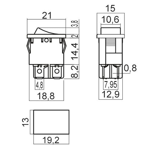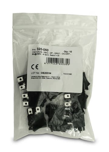** Caratteristiche Generali ** Attuatore: Bilanciere Serie: Miniatura Serigrafia: I/O Luminoso: no Colore: Nero Materiale attuatore: Plastica Tipi contatti: DPST Portata: 6A@250Vac, 10A@125Vac N. poli: 2 Stato dei contatti: ON/OFF Tipo terminale: faston 4,8 N. terminali: 4 Montaggio: Pannello a incastro Foro fissaggio: 13mm x 19.2mm