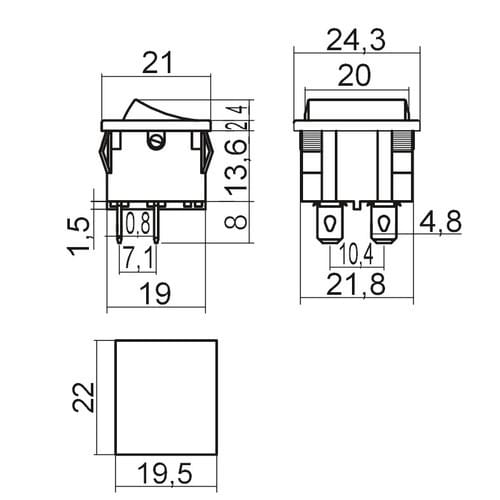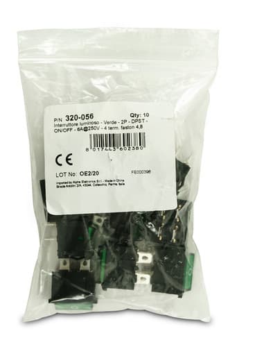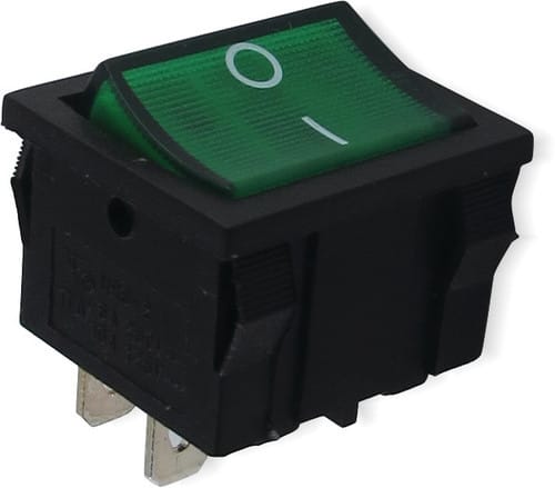 ** Caratteristiche Generali ** Attuatore: Bilanciere Serie: Miniatura Serigrafia: I/O Luminoso: si Colore illuminazione: Verde Colore: Verde Materiale attuatore: Plastica Tipi contatti: DPST Portata: 6A@250Vac, 10A@125Vac N. poli: 2 Stato dei contatti: ON/OFF Tipo terminale: faston 4,8 N. terminali: 4 Montaggio: Pannello a incastro Foro fissaggio: 22mm x 19.5mm