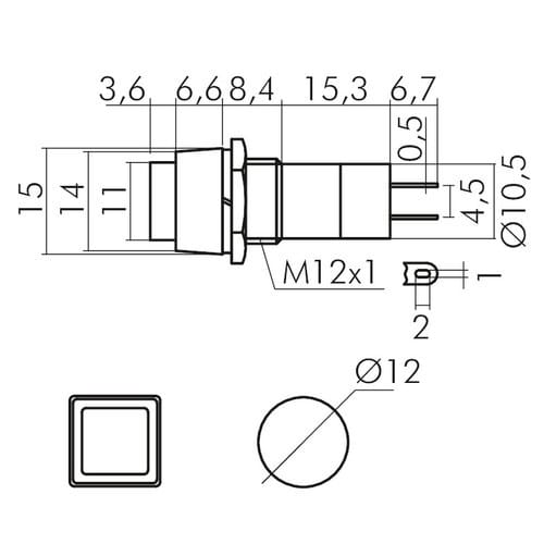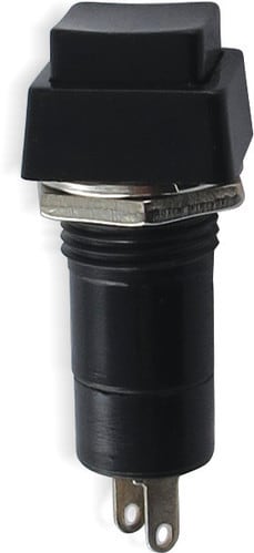 ** Caratteristiche Generali ** Attuatore: Pulsante Serigrafia: Nessuna Luminoso: no Colore: Nero Materiale attuatore: Plastica Tipi contatti: SPST Portata: 1A@250Vac, 3A@125Vac N. poli: 1 Stato dei contatti: ON/OFF Tipo terminale: a saldare N. terminali:2 Montaggio: Pannello con dado Foro fissaggio: ø12mm