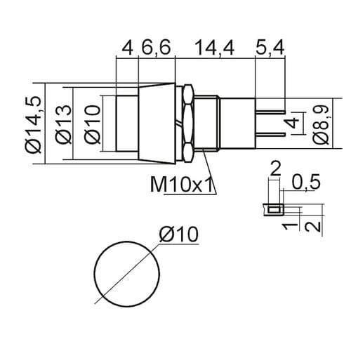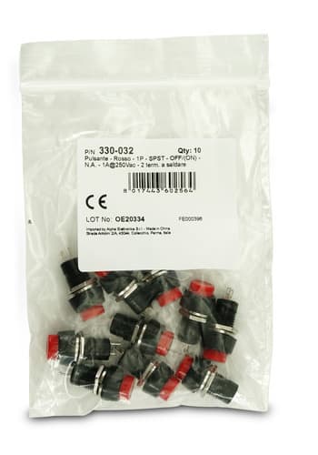 ** Caratteristiche Generali ** Attuatore: Pulsante Serigrafia: Nessuna Luminoso: no Colore: Rosso Materiale attuatore: Plastica Tipi contatti: SPST Portata: 1A@250Vac, 3A@125Vac N. poli: 1 Stato dei contatti: OFF/(ON) - N.A. Tipo terminale: a saldare N. terminali: 2 Montaggio: Pannello con dado Foro fissaggio: ø10mm