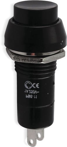 ** Caratteristiche Generali ** Attuatore: Pulsante Serigrafia: Nessuna Luminoso: no Colore: Nero Materiale attuatore: Plastica Tipi contatti: SPST Portata: 1A@250Vac, 3A@125Vac N. poli: 1 Stato dei contatti: OFF/(ON) - N.A. Tipo terminale: a saldare N. terminali: 2 Montaggio: Pannello con dado Foro fissaggio: ø12mm