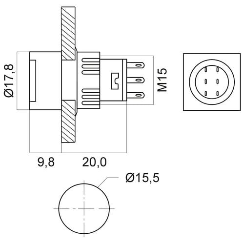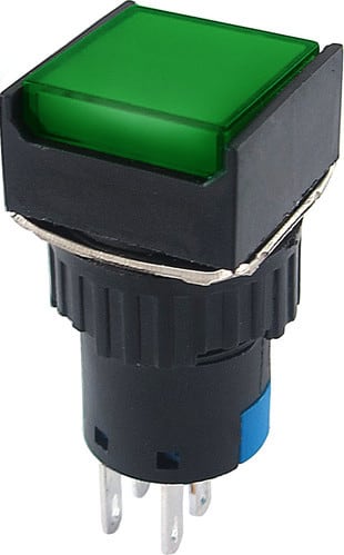 ** Caratteristiche Generali ** Attuatore: Pulsante Serigrafia: Nessuna Luminoso: no Colore: Verde Materiale attuatore: Plastica Tipi contatti: DPDT Portata: 3A@250Vac N. poli: 2 Stato dei contatti: ON/ON Tipo terminale: a saldare N. terminali: 6 Montaggio: Pannello con dado Foro fissaggio: ø15.5mm Grado di protezione: IP40