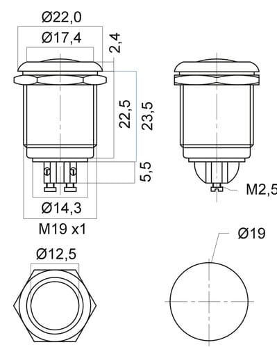** Caratteristiche Generali ** Attuatore: Pulsante antivandalo Serie: Antivandalo Serigrafia: Nessuna Luminoso: no Colore: Metallo Materiale attuatore: Ottone nichelato Tipi contatti: SPST Portata: 2A@250Vac, 4A@125Vac N. poli: 1 Stato dei contatti: OFF/(ON) - N.A. Tipo terminale: vite N. terminali: 2 Montaggio: Pannello con dado Foro fissaggio: ø19mm Note aggiuntive: antivandalo rientrato, waterproof Grado di protezione: IP66 Temperatura di lavoro: -20 / 55°C