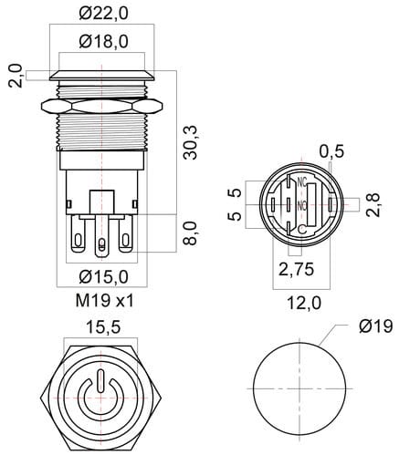 ** Caratteristiche Generali ** Attuatore: Pulsante antivandalo Serie: Antivandalo Forma dell'attuatore: Convesso Serigrafia: ON/OFF Luminoso: si Colore illuminazione: Rosso Tensione illuminazione: 12Vac/dc Colore: Nero Materiale attuatore: Acciaio Tipi contatti: SPDT Portata: 5A@250Vac, 5A@36Vdc N. poli: 1 Stato dei contatti: ON/ON Tipo terminale: a saldare N. terminali: 5 Montaggio: Pannello con dado Foro fissaggio: ø19mm Grado di protezione: IP67 Temperatura di lavoro: -20 / 55°C
