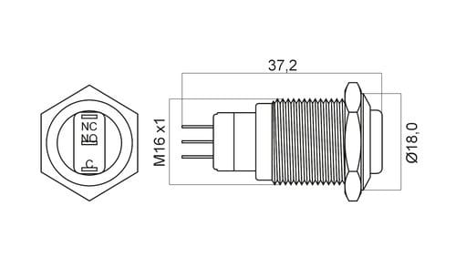 ** Caratteristiche Generali ** Attuatore: Pulsante antivandalo Serie: Antivandalo Forma dell'attuatore: In rilievo Luminoso: no Colore: Lucido Materiale attuatore: Acciaio Tipi contatti: SPDT Portata: 5A@250Vac, 5A@36Vdc N. poli: 1 Stato dei contatti: ON/ON Tipo terminale: a saldare N. terminali: 3 Montaggio: Pannello con dado Foro fissaggio: ø16mm Grado di protezione: IP65 Temperatura di lavoro: -10 / 40°C