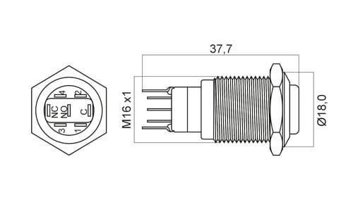 ** Caratteristiche Generali ** Attuatore: Pulsante antivandalo Serie: Antivandalo Forma dell'attuatore: In rilievo Luminoso: si Colore illuminazione: Rosso/Verde Tensione illuminazione: 24Vac/dc Colore: Lucido Materiale attuatore: Acciaio Tipi contatti: SPDT Portata: 5A@250Vac, 5A@36Vdc N. poli: 1 Stato dei contatti: ON/ON Tipo terminale: a saldare N. terminali: 5 Montaggio: Pannello con dado Foro fissaggio: ø16mm Grado di protezione: IP65 Temperatura di lavoro: -10 / 40°C