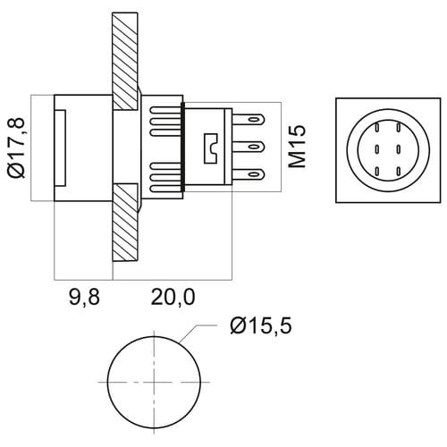 ** Caratteristiche Generali ** Attuatore: Pulsante Forma dell'attuatore: Piatto Serigrafia: Nessuna Luminoso: no Colore: Rosso Materiale attuatore: Plastica Tipi contatti: DPDT Portata: 3A@250Vac N. poli: 2 Stato dei contatti: (ON)/ON Tipo terminale: a saldare N. terminali: 6 Montaggio: Pannello con dado Foro fissaggio: ø15.5mm Grado di protezione: IP40