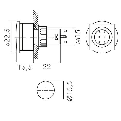 ** Caratteristiche Generali ** Attuatore: Pulsante Forma dell'attuatore: Convesso Serigrafia: Nessuna Luminoso: no Colore: Rosso Materiale attuatore: Plastica Tipi contatti: DPDT Portata: 3A@250Vac N. poli: 2 Stato dei contatti: ON/ON Tipo terminale: a saldare N. terminali: 6 Montaggio: Pannello con dado Foro fissaggio: ø15.5mm Grado di protezione: IP40